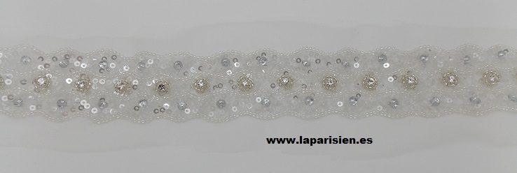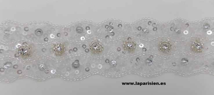 Aplicación con adornos realizada con materiales de alta calidad y lentejuelas de fantasía. Es un complemento ideal para aplicar a un vestido y darle un toque personal.