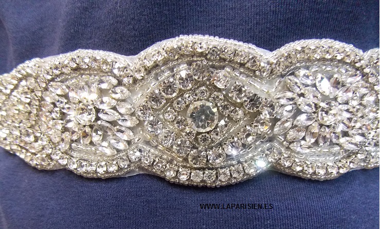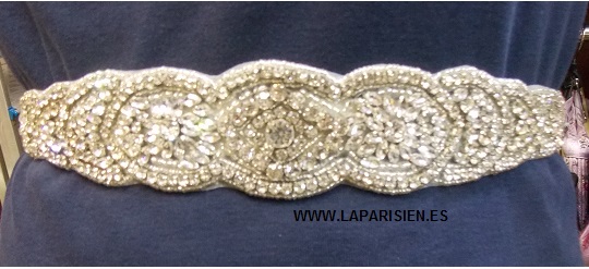 Cinturón de raso marfil con adorno confeccionado con cristales de alta calidad. Sujeción con enganche a la espalda.