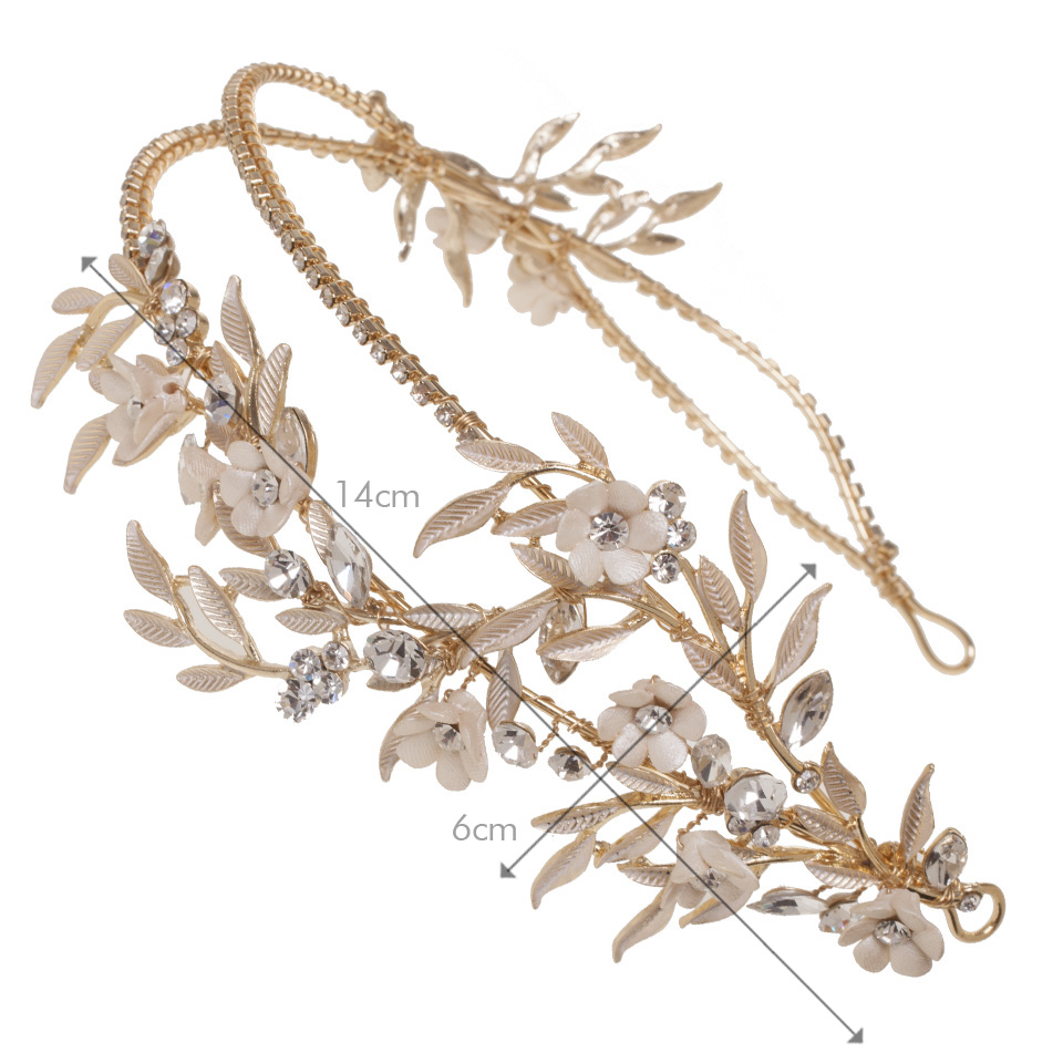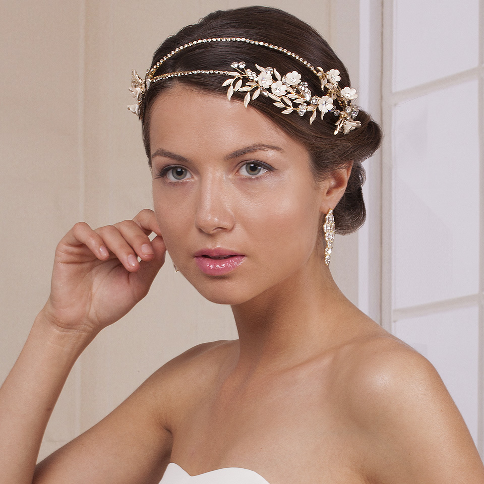 Diadema de novia fabricada con cristal de alta calidad y delicadas florecillas de porcelana fría. Un bello diseño muy elaborado y moderno.
