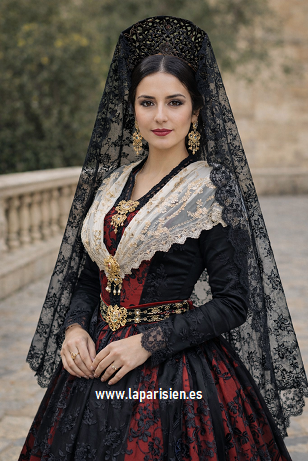 Mantilla de encaje negro de gran elegancia y finura, confeccionada con un delicado motivo floral y un festón trabajado en todo su contorno. Su transparencia equilibrada realza la belleza del dibujo, aportando profundidad y ligereza al conjunto. Ideal para lucir con peineta, cae con naturalidad sobre hombros y espalda, aportando un aire clásico y distinguido. Perfecta para trajes regionales, actos tradicionales y celebraciones donde la artesanía y la tradición son protagonistas.
