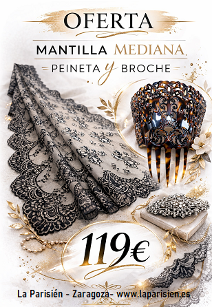 Descubre nuestro elegante conjunto de mantilla negra, peineta y broche de tamaño mediano, una opción perfecta para lucir la auténtica tradición española con equilibrio y estilo.