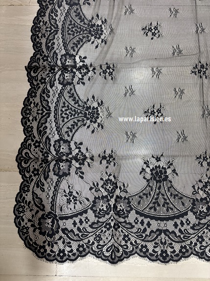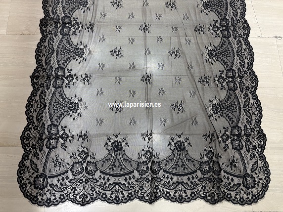 Nuestra mantilla española de encaje negro (1X2,20 mts) combina tradición, distinción y artesanía en una pieza imprescindible para ocasiones especiales. Confeccionada en delicado tul bordado con motivos florales y rematada con blonda ancha en todo el contorno, sin costuras, ofrece una caída ligera, elegante y muy favorecedora sobre peineta.