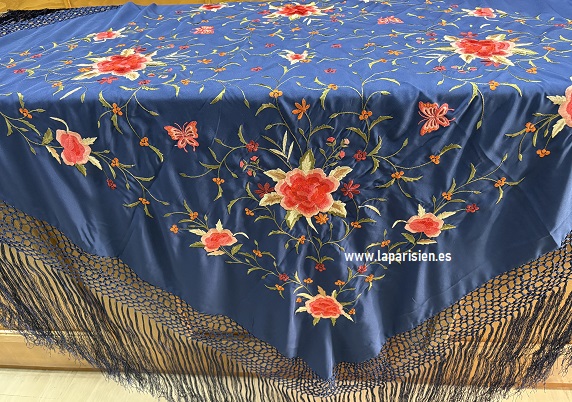 Descubre la elegancia atemporal de este mantón de Manila mediano, una pieza imprescindible para quienes buscan sofisticación y tradición en un solo complemento. Con unas medidas de 110×110 cm y un espectacular fleco anudado a mano de 45 cm, este mantón destaca por su fondo en color marino, que realza delicadamente su bordado floral en suaves tonos pastel.