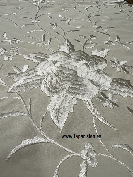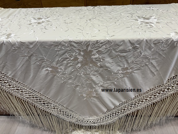 Mantón de Manila beig bordado al tono, 132×132 cm más 60 de cm de fleco, bordado artesano, crespón de seda.
