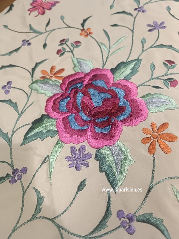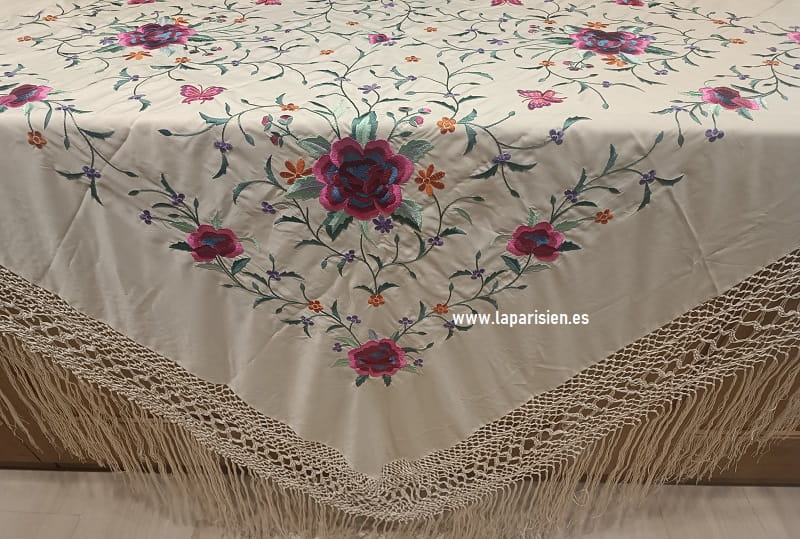 132×132 cm más el fleco. Beig bordado en colores. IVA y portes de envío incluidos.
