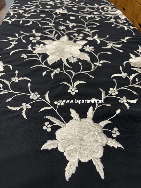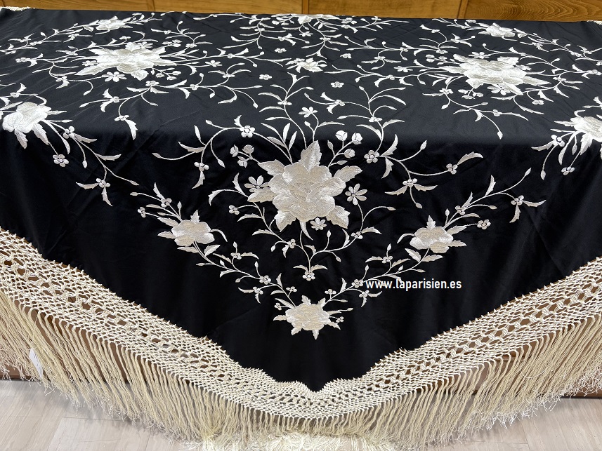 132×132 cm más el fleco (60 CM). Negro bordado en marfil, fleco marfil, crespón de seda, bordado artesano, IVA y portes de envío incluidos.