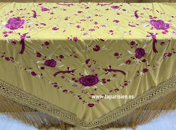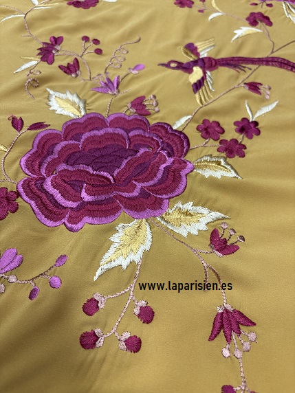 El mantón de Manila es una pieza emblemática de la cultura española, conocida por su elegancia y sofisticación. Este mantón, con dimensiones de 132×132 cm y un fleco de 60 cm, destaca por su vibrante fondo mostaza que aporta luz y calidez a cualquier ambiente.
