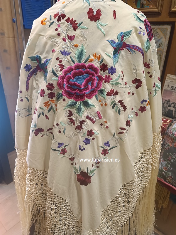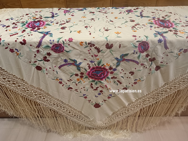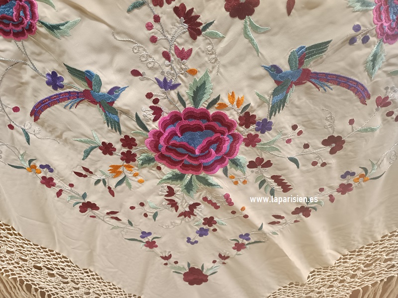 135X135 CM MÁS EL FLECO. beig bordado en colores.