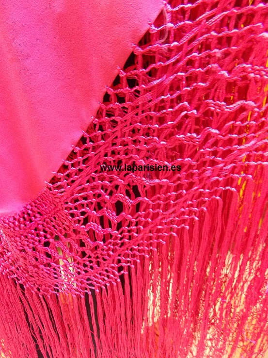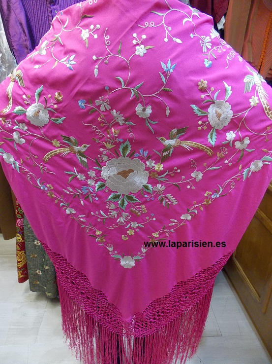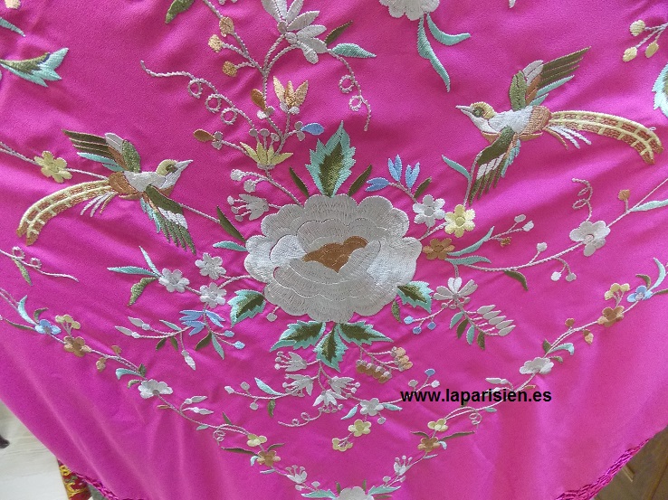 Fucsia bordado a máquina en colores, crespón de seda. 135×135 cm más el fleco. IVA y portes de envío incluidos en el precio.