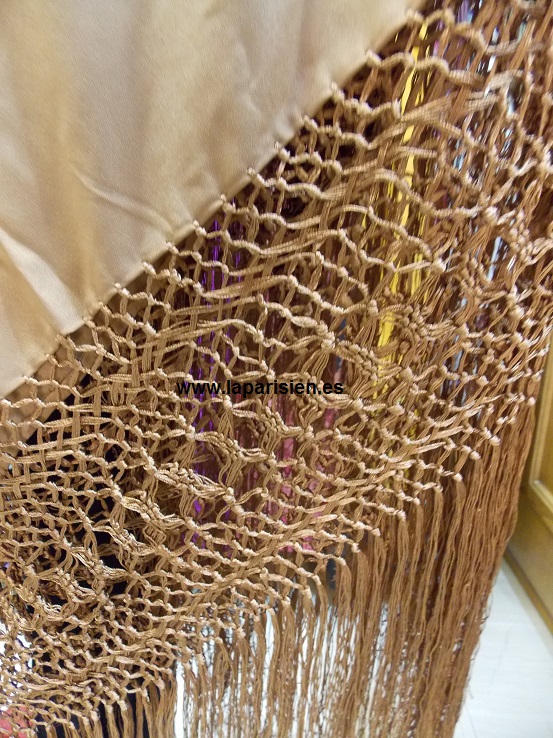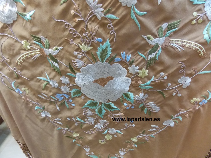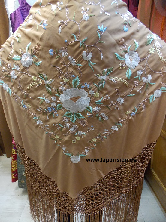 Marrón bordado a máquina en colores, crespón de seda. 135×135 cm más el fleco. IVA y portes de envío incluidos en el precio.