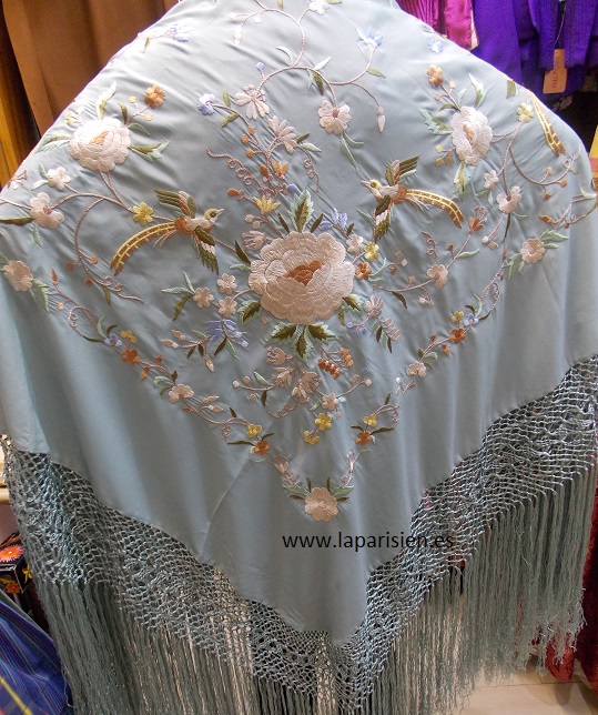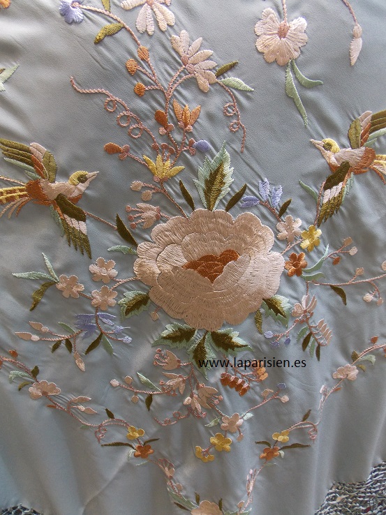 Azul celeste bordado a máquina en colores, crespón de seda, 135×135 cm más el fleco, seda natural, IVA y portes incluidos