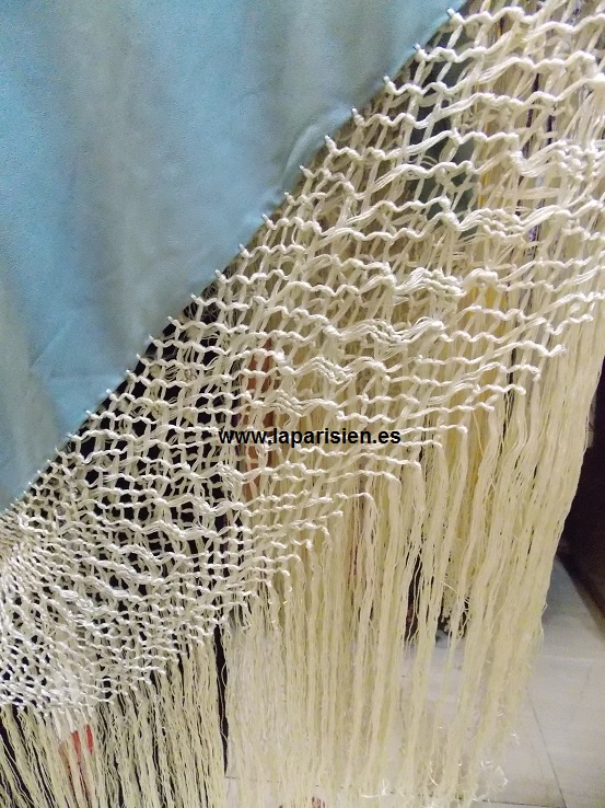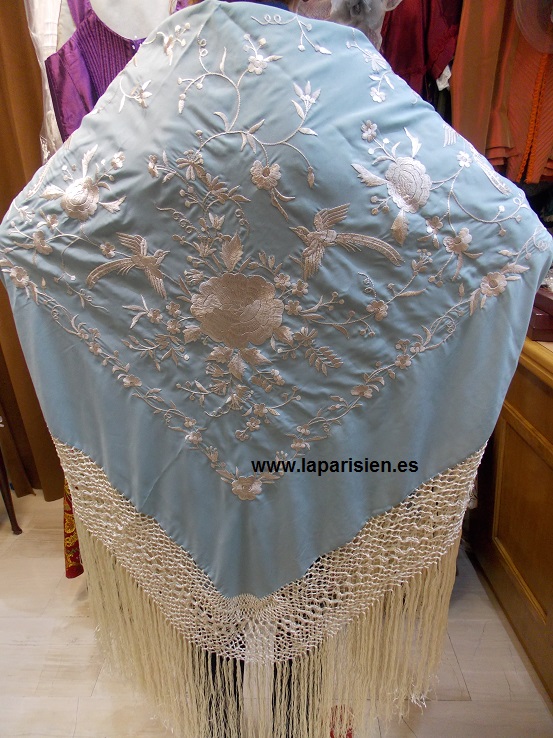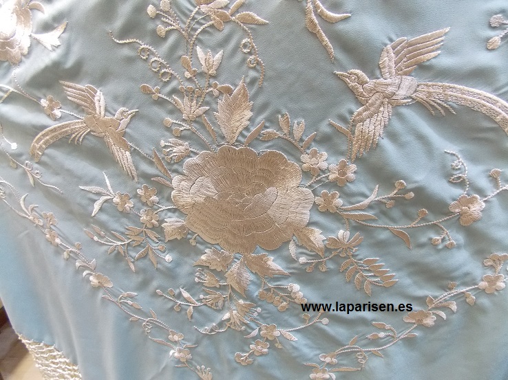 Celesta bordado a máquina en crema, crespón de seda. 135×135 cm más el fleco. IVA y portes de envío incluidos en el precio.