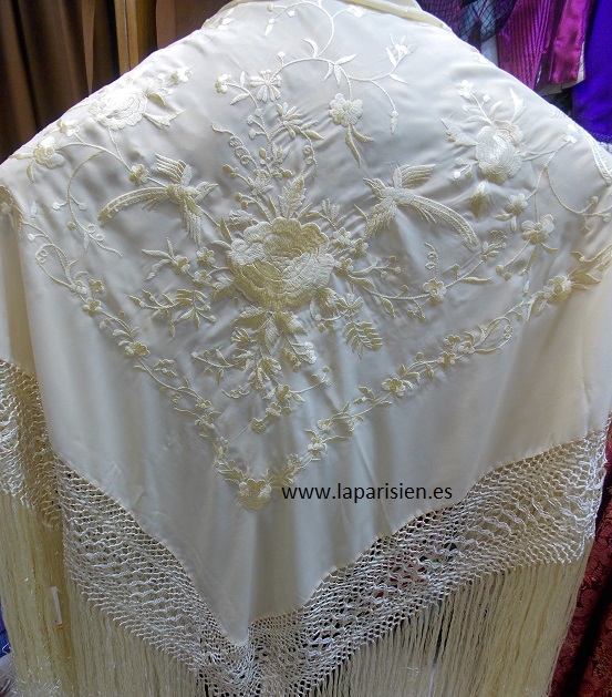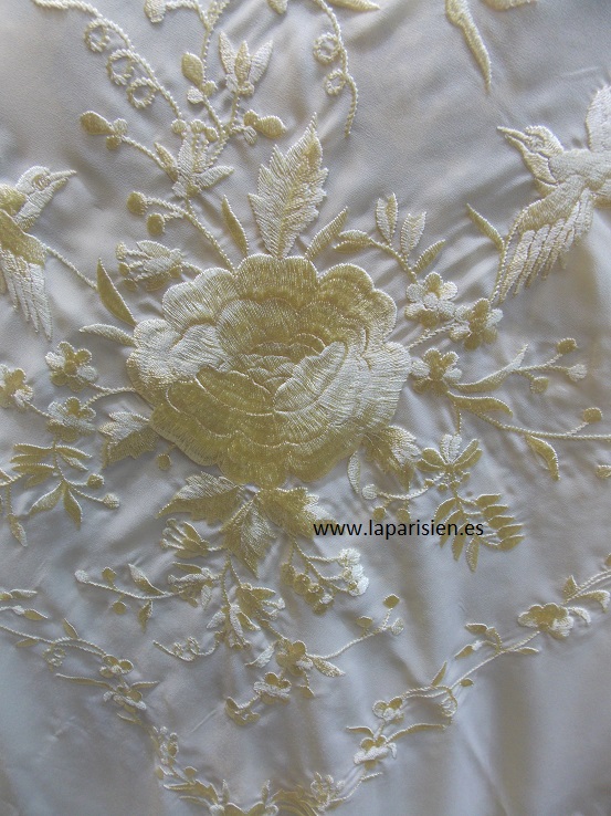 Crema bordado a máquina en crema, crespón de seda, 135×135 cm más el fleco, seda natural, IVA y portes incluidos
