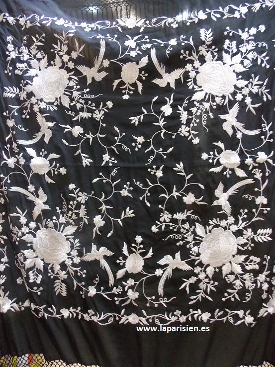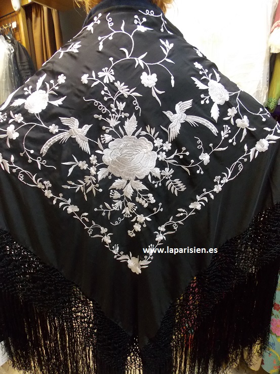 Negro bordado en blanco, 135×135 cm más el fleco, seda natural, IVA y portes incluídos.