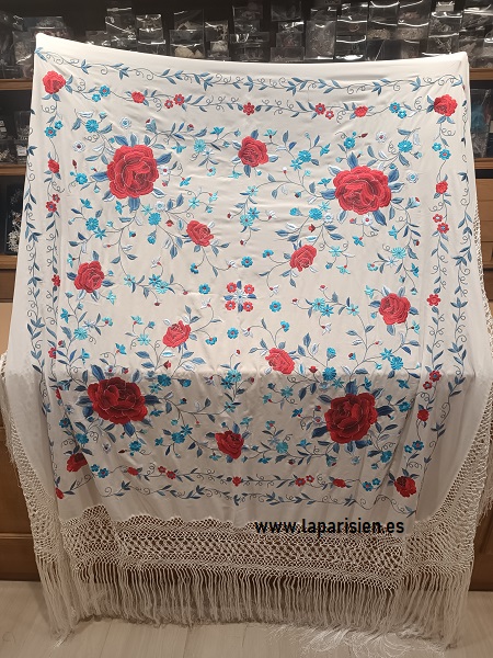 Marfil bordado con flor roja y tonos azules y grises, 140×140 cm más el fleco, bordado artesano. IVA y portes de envío incluidos.