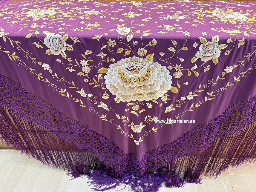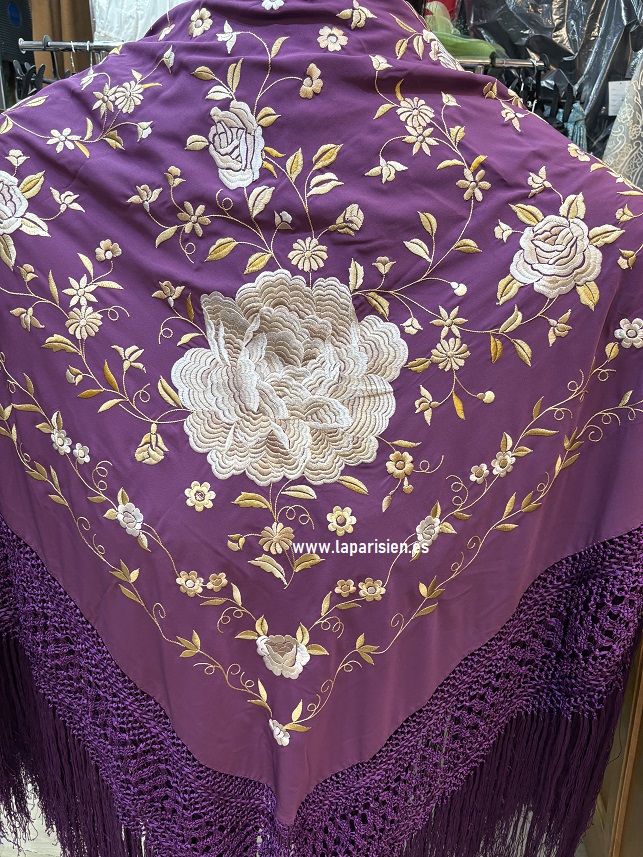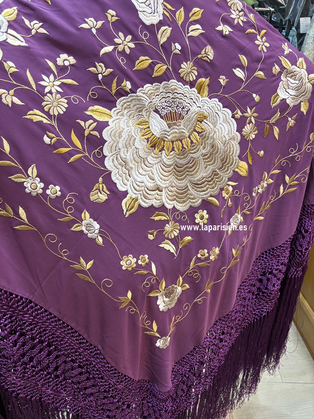 Elegante mantón de Manila en crespón de seda morado, artesanalmente bordado en tonos secos. Mide 140×140 cm más flecos. Refleja tradición, sofisticación y delicadeza en cada detalle bordado.