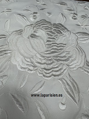 El mantón de Manila es una pieza icónica de la cultura española. Este modelo en tono blanco roto aporta una estética refinada y luminosa, ideal para combinar con una amplia variedad de colores y estilos. Su bordado monocromático realza la textura y el diseño sin perder armonía.