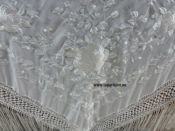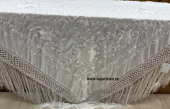 Mantón de Manila bordado en blanco roto de 140×140 cm con flecos de 60 cm anudados a mano. Elegante, ligero y perfecto para indumentaria regional, eventos y ocasiones especiales.