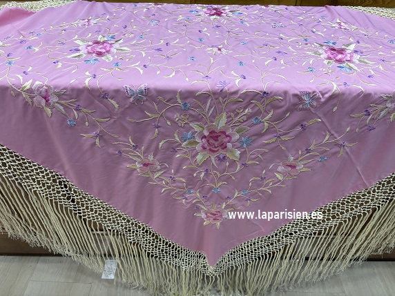 Mantón mediano rosa bordado en tonos pálidos, 1,10×1,10 mts más 0,40 mts de fleco en color beig