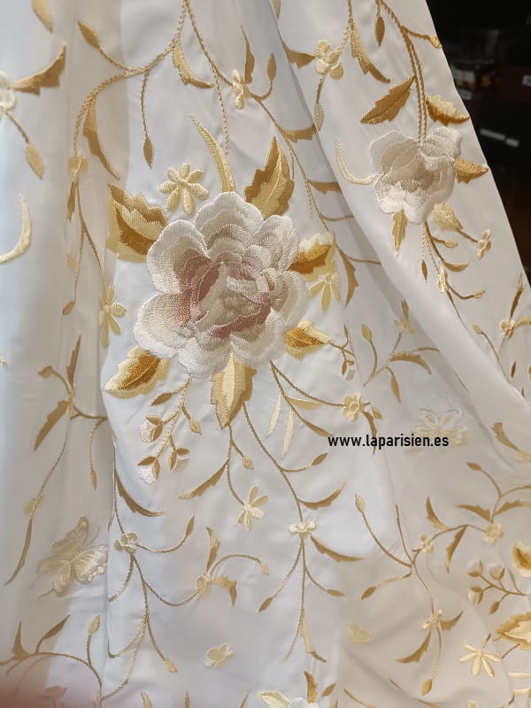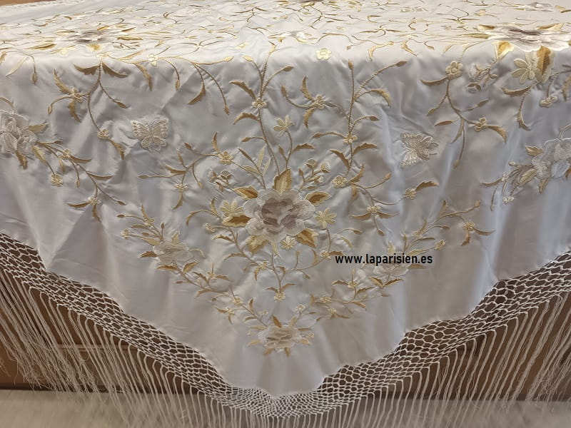 Mantón mediano 1,10×1,10 mts, blanco bordado en dorados y tonos secos.