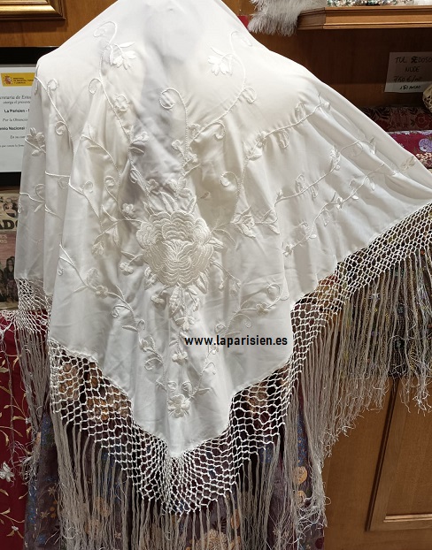 Marfil bordado en marfil.Crespón de seda, 170×80 cm más el fleco hecho a mano (50 cm). IVA y portes incluidos..(se puede personalizar fondo y colores del bordado).