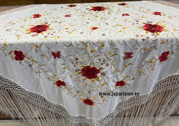 110×110 cm más el fleco, crespón de seda, bordado artesano.