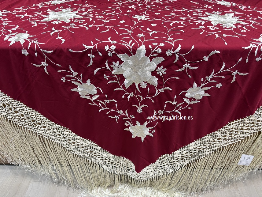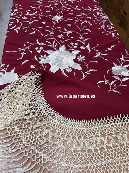 132×132 cm más el fleco (60 CM). Burdeos bordado en marfil, fleco marfil, crespón de seda, bordado artesano, IVA y portes de envío incluidos.