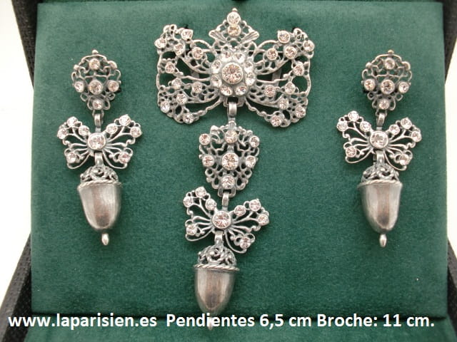 Juego pendientes y broche. BisuterĂ­a color plata. Cierre Omega.Juego pendientes y broche