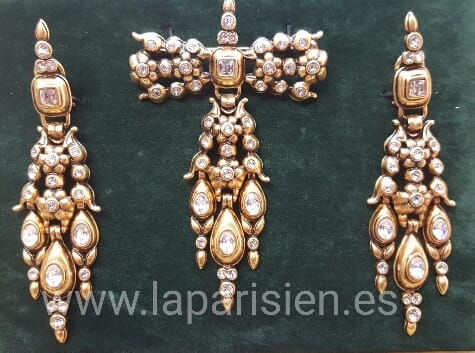 Juego de pendientes y broche. Bisutería color dorado. Largo max: 9 cmJuego pendientes y broche