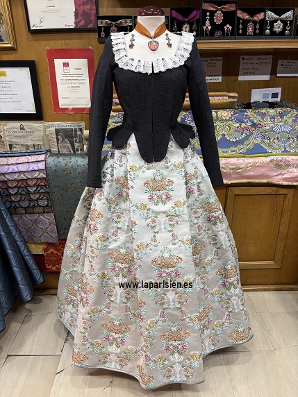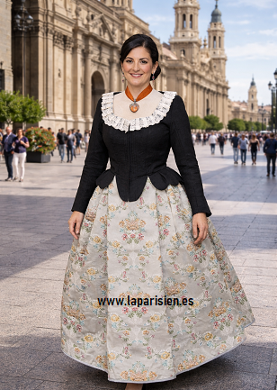 Traje regional aragonés femenino, compuesto por justillo negro de manga larga con escote adornado en encaje blanco y falda amplia de tejido brocado floral en tonos suaves. Conjunto de inspiración tradicional, realzado con medalla central y cuidada confección, perfecto para actos folclóricos, fiestas populares y celebraciones culturales en Aragón.