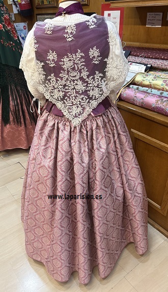 Falda larga y amplia, confeccionada en tejido brocado de tono rosa empolvado con dibujo geométrico clásico. Presenta gran vuelo (3 largos) y caída elegante, aportando volumen y movimiento característicos del traje tradicional. Todas las tallas previo encargo