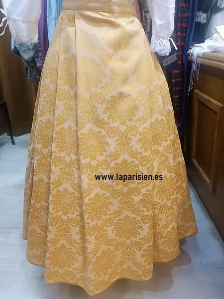 La pieza principal es una falda adamascada de gran caída y cuerpo, confeccionada en tejido damasco de alta calidad que aporta brillo sutil, textura y movimiento. Disponible en tres largos diferentes, se adapta a todas las estaturas y se realiza bajo encargo en todas las tallas, garantizando un ajuste perfecto.