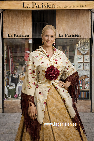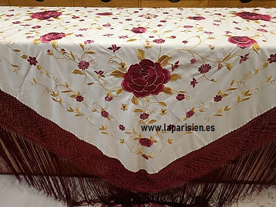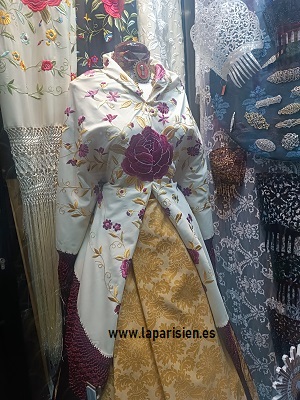 El conjunto se completa con un mantón de Manila bordado, de 140 x 140 cm más 60 cm de fleco, ideal para lucir sobre los hombros o anudado al estilo tradicional. Sus flecos largos aportan vuelo y realzan cada movimiento, añadiendo carácter y distinción al traje.