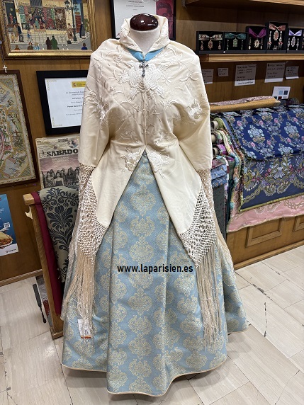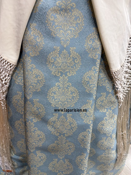 Este elegante conjunto de indumentaria tradicional combina una falda regional de tejido brocado en azul con motivos dorados de tres largos y un delicado mantón de Manila color marfil bordado con flecos largos, creando una silueta clásica, femenina y atemporal.