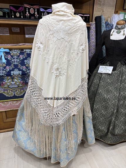 El mantón de Manila 279,95 €, confeccionado en tono marfil, presenta bordados florales y flecos artesanales, aportando ligereza y elegancia. Puede colocarse sobre los hombros o cruzado al pecho, completando el look regional con un aire distinguido. 132×132 cm más 60 cm fleco.