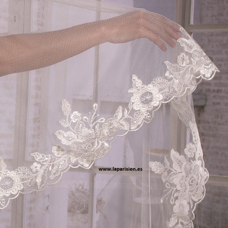 Velo de novia decorado con encaje acabado rebrodé, bellamente adornado con hojas y flores salpicadas con lentejuelas transparentes.