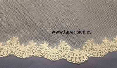 Velo de novias con confeccionado en suave tul y encaje rebrodé de 4 cm con delicadas perlitas con mucha caída, 2X3 mts.