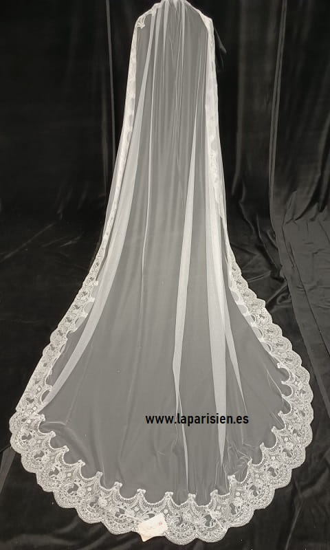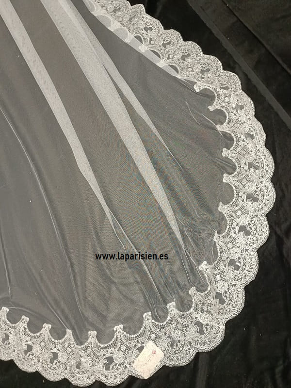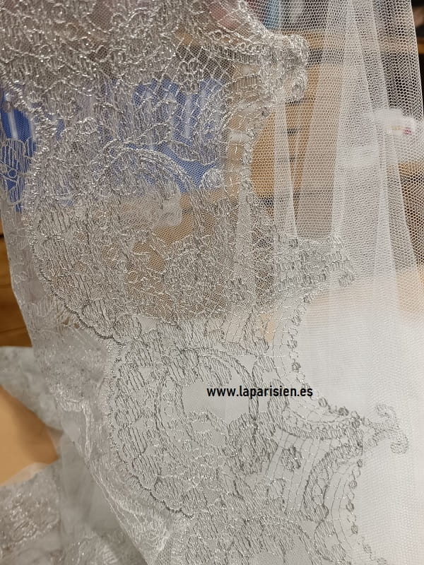 Velo metalizado,Ovalado, tul sedoso en blanco natural-roto, puntilla plateada 15 cm de ancho, 2×3 mts (otras medidas, consultar) IVA y portes de envĂo incluidos en el precio.