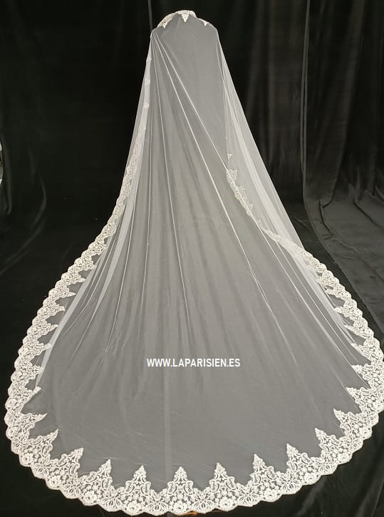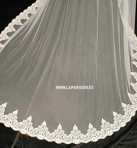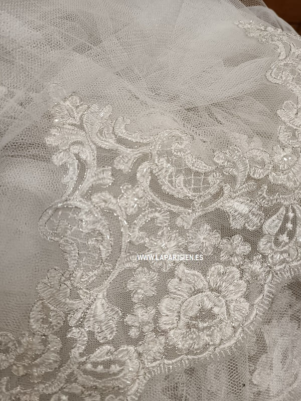 Velo bordado en hilo plateado, ancho máximo puntilla 16 cm, ovalado, 250×300 cm. IVA y portes incluídos. Color blanco roto – natural. Tul sedoso.