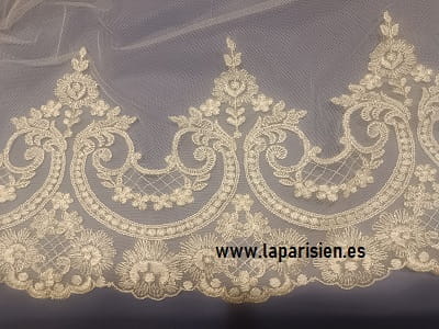 Bordado en hilo plateado. 2×3 metros, ovaladao. Blanco roto- natural. tul sedoso con mucha caída. Ancho máximo puntilla: 23 cm. IVA y portes de envío incluidos.